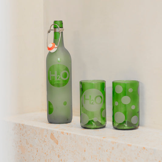UPcycled Cadeauset van 1 "H2O" Waterfles & 2 Drinkglazen - Duurzame Waterfles & Glazen