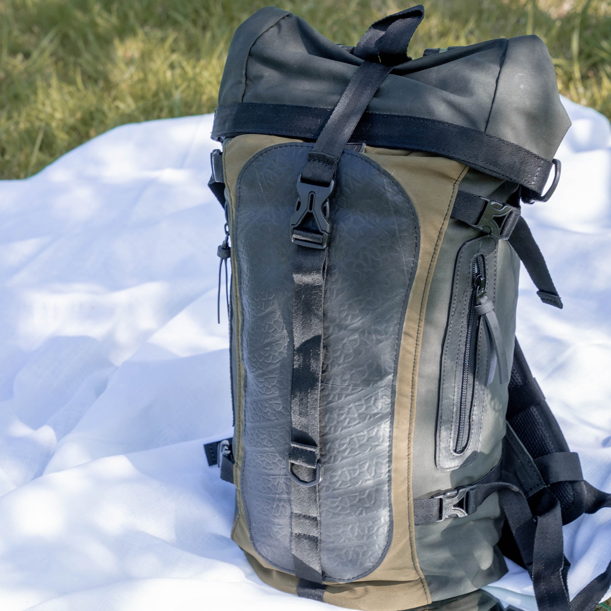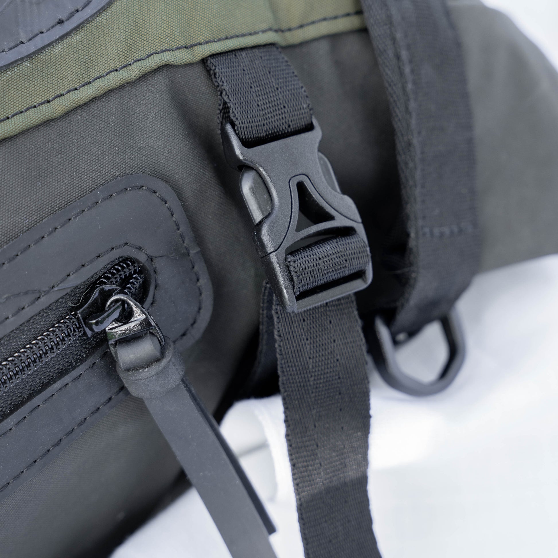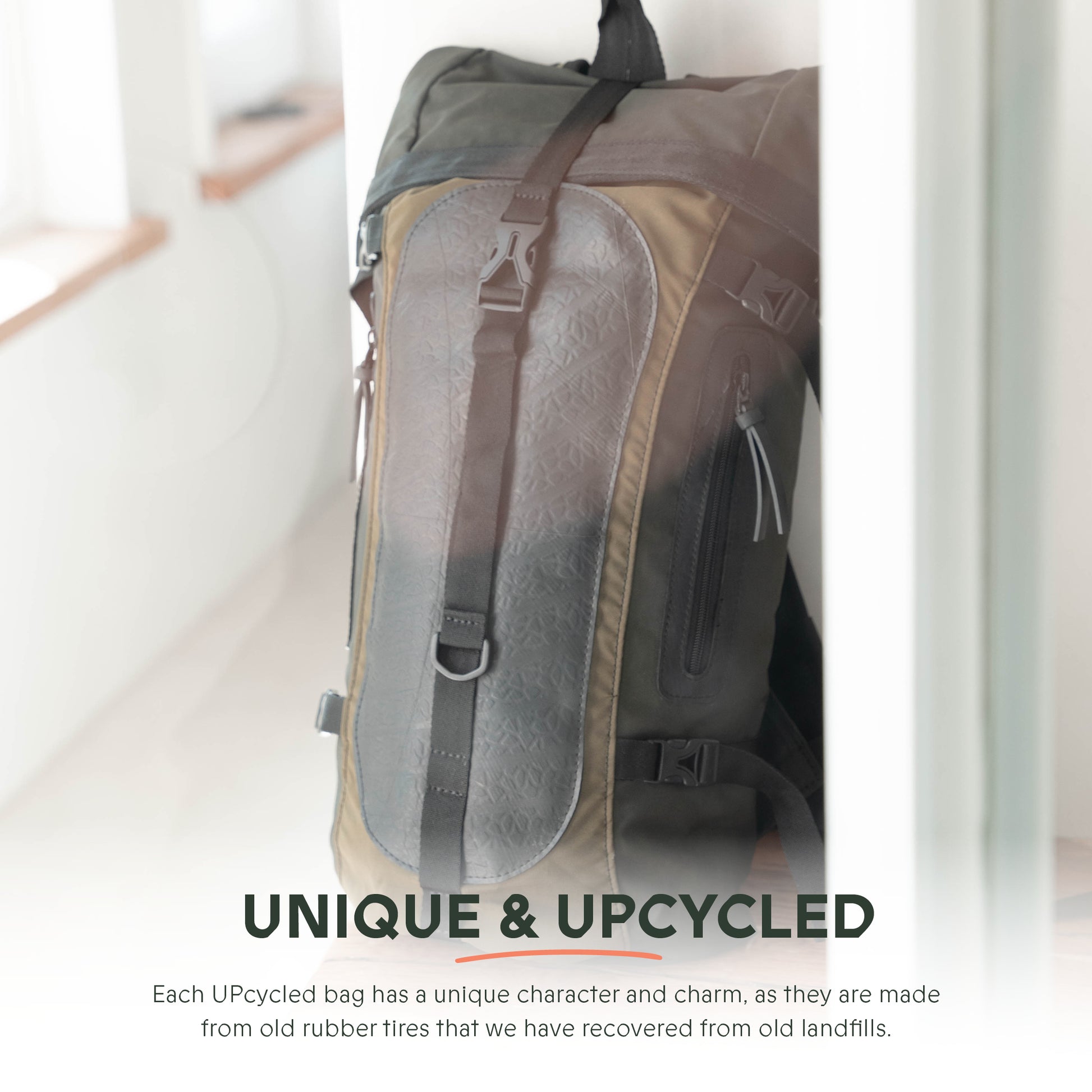 Kleur: Het heeft een stoer, tweekleurig kleurenpalet met diep olijfgroen en zwarte accenten. De olijfgroene basis geeft het een avontuurlijke, militair geïnspireerde uitstraling, terwijl de zwarte details, inclusief de UPcycled rubberen panelen en ritsen, contrast en duurzaamheid toevoegen. Let op: door het gebruik van UPcycled materialen zoals oude rubberen banden kunnen er lichte variaties in kleur en textuur optreden, waardoor elke rugzak uniek is.